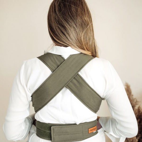 - Ziehen Sie die Babytrage gut fest, um das Kind möglichst nah am Körper zu tragen. Ein stabiler Hüftgurt entlastet die Schultern.